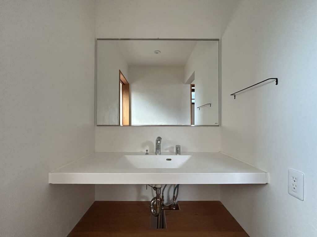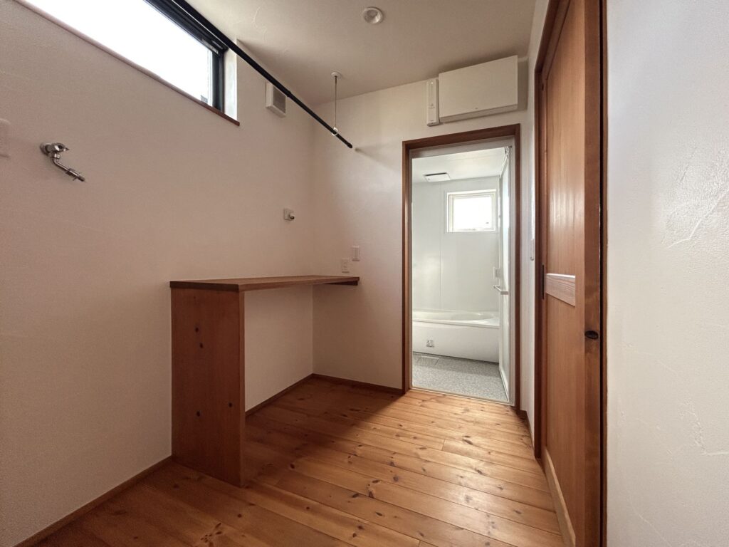 洗面には室内干しのバーとカウンターがあり、干して畳んだりアイロンをかけたりが出来るスペースです