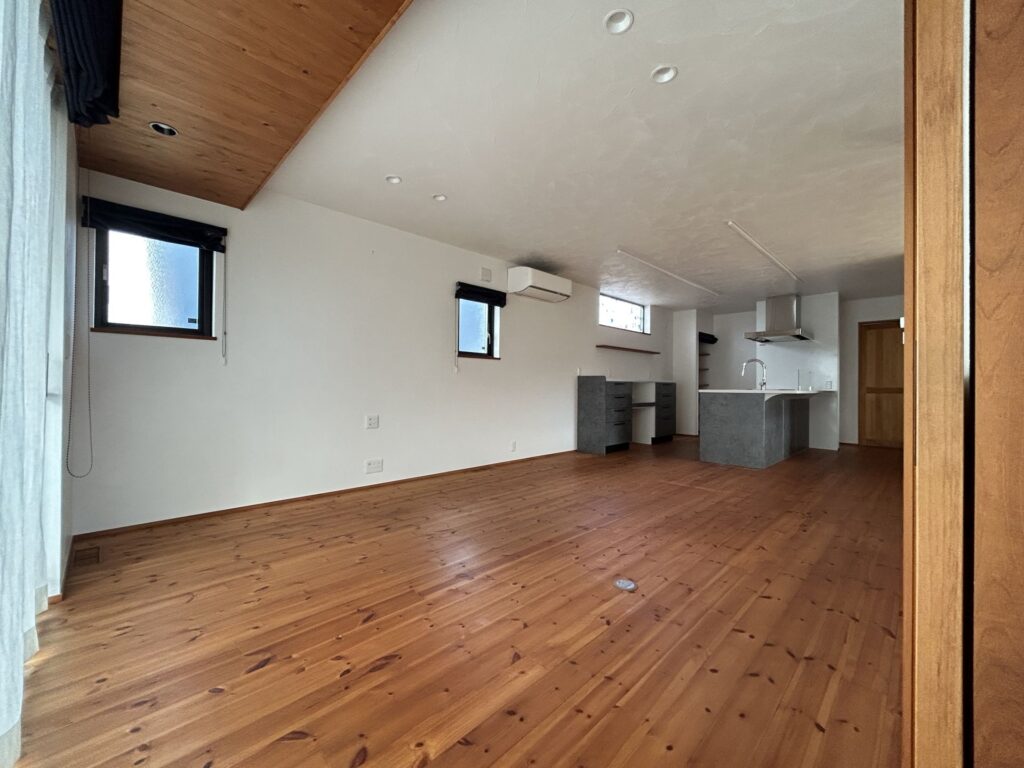 1階リビングは20帖以上と広々、全面無垢フローリングに壁は漆喰、自然素材で心地よい空間