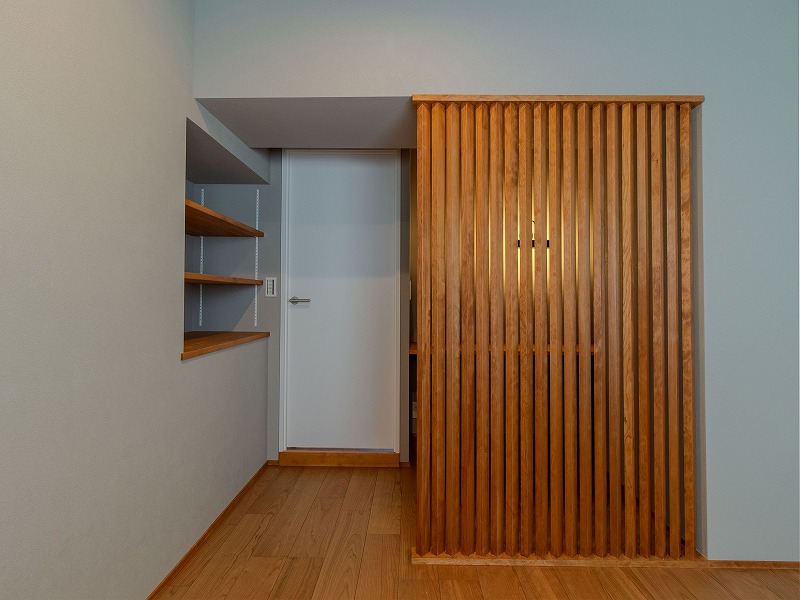 奥に見える木製のルーバー(縦格子)状の間仕切りが特徴的です。プライベートな空間を確保しつつも、閉塞感を与えない工夫が魅力的です。
