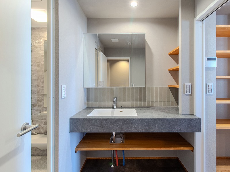 洗面ボウルと一体化したグレーのカウンタートップは、コンクリートのような質感でモダンな印象です。壁の白、木の棚の色合いとのコントラストが美しいです。