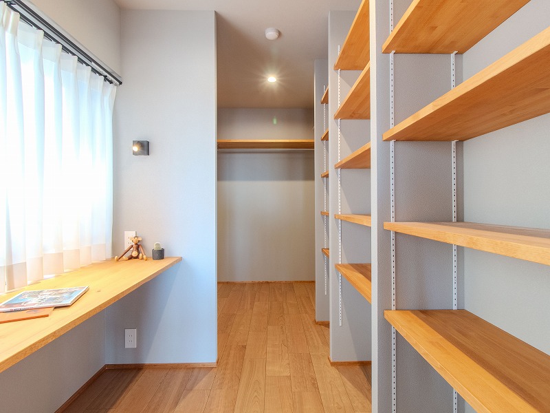 多目的に使えるコンパクトな空間!壁に沿って設置されたカウンターデスクは、書斎スペース、趣味の作業台、メイクスペースなど、様々な用途に活用できます♪