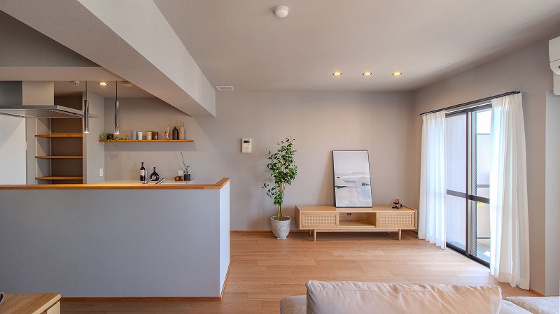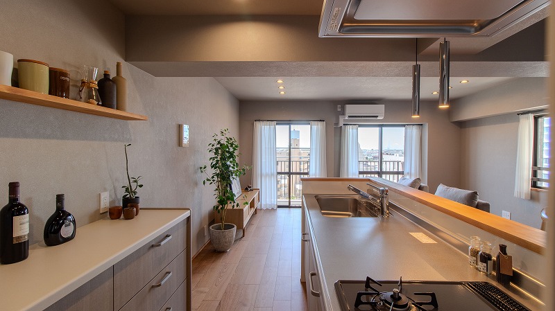 キッチンはカウンタータイプで、リビング・ダイニングとの一体感を保ちつつ、手元を隠せる配慮もされています。