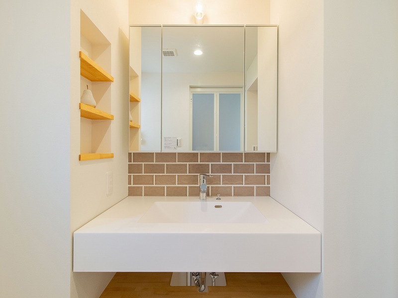 ≪洗面≫洗面台の背面には、レンガ調のタイルが貼られています。このタイルが空間のアクセントになり、シンプルさの中にも温かみと個性を作り出しています。