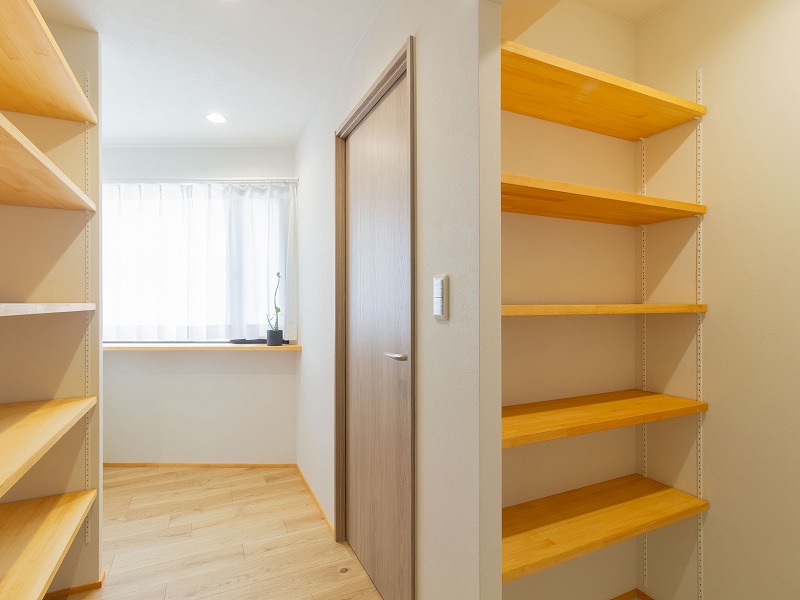 ≪玄関≫玄関を入ってすぐの場所に、壁一面に広がるオープンな棚が設けられています。小物や飾りを置いて、おしゃれな空間を演出できます。