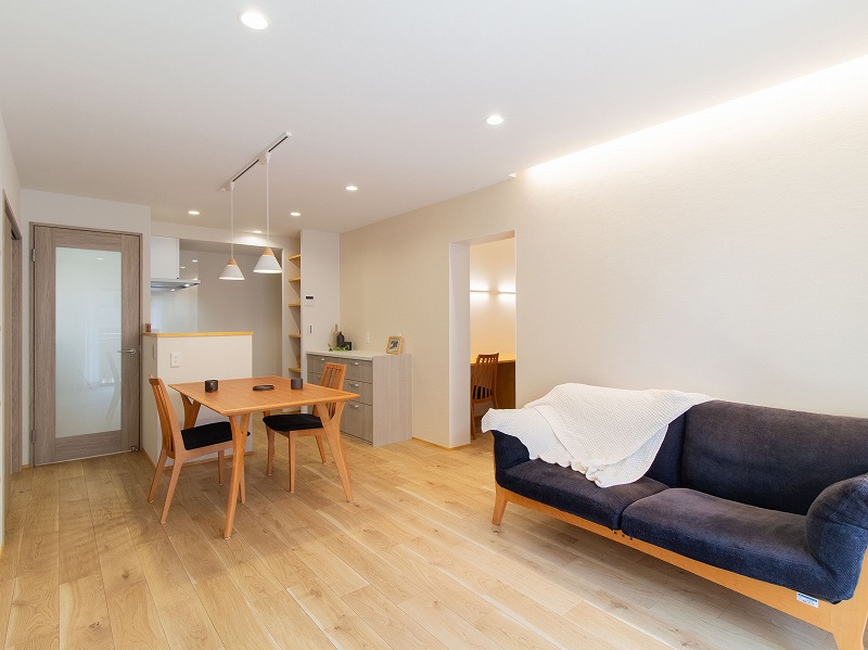 ≪LDK≫明るく広々としたLDK。天井に埋め込まれたダウンライトと、壁を照らす間接照明が、部屋全体を優しく照らしています。