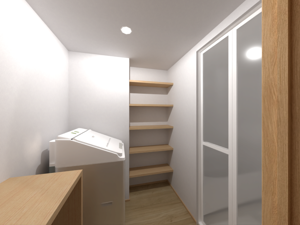脱衣室には収納やカウンターを設けました。洗濯を畳んだりアイロンをかけたり多用に使えます。 ※イメージパース